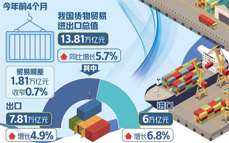 | 前4個(gè)月貨物貿(mào)易進(jìn)出口總值13.81萬億元 |