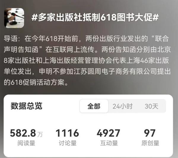 日前,兩份來自出版行業(yè)的“聯(lián)合聲明告知函”在網(wǎng)上流傳,引發(fā)大范圍討論,并最終成為一個焦點話題,“多家出版社抵制618圖書大促”。