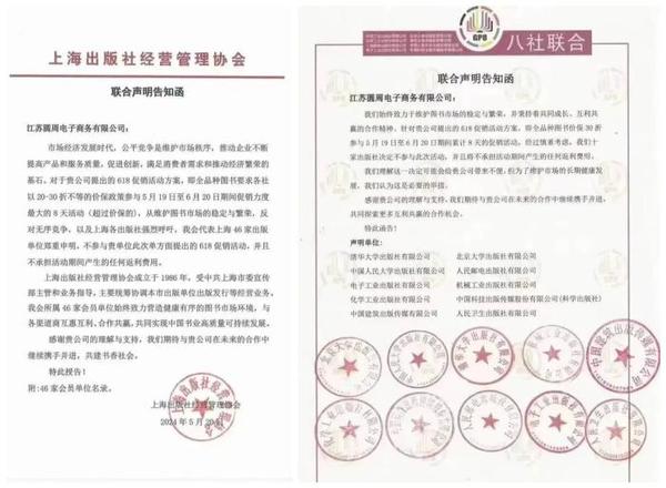 網(wǎng)上流傳的兩份“聯(lián)合聲明告知函”顯示,北京的一些出版社,以及上海出版社經(jīng)營管理協(xié)會代表上海46家出版單位,均聲明不參與江蘇圓周電子商務有限公司此次提出的618促銷活動方案,也不承擔活動期間產(chǎn)生的任何返利費用。