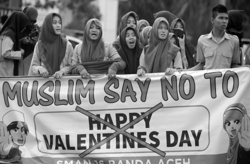2月13日,印尼亞齊省的穆斯林學(xué)生手持橫幅,抗議 慶祝情人節(jié)。