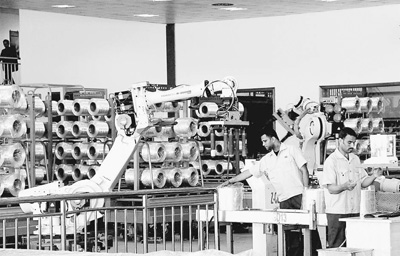 2015年,新蘇伊士運(yùn)河的開通拉動(dòng)了埃及的制造業(yè)和基礎(chǔ)設(shè)施建設(shè)。圖為在北非最大的玻璃纖維制造企業(yè)埃及巨石公司,埃及員工與“機(jī)械手臂”一同生產(chǎn)的場景。王云松攝