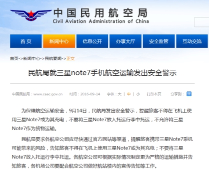 受三星“炸機(jī)門”事件持續(xù)發(fā)酵的影響,為了保障乘客出行安全,中國(guó)各大航空公司對(duì)三星Note7紛紛下達(dá)了“封殺令”! 9月13日,中國(guó)首家航空公司-海南航空宣布禁止集團(tuán)員工攜帶Note7登機(jī)、托運(yùn),并且也不接受旅客在飛機(jī)上使用和托運(yùn)Note7。隨后,中國(guó)民航局要求各航空公司應(yīng)盡快通過(guò)官方網(wǎng)站等渠道,提醒旅客攜帶Note7乘機(jī)可能帶來(lái)的風(fēng)險(xiǎn)。截至9月15日,中國(guó)國(guó)內(nèi)已有14家航空公司針對(duì)Note7出臺(tái)禁令。