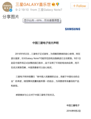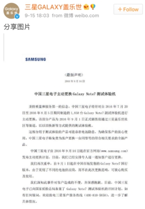 迫于壓力,三星方面關(guān)于Note7在中國(guó)的政策也發(fā)生了變化。9月14日,三星在國(guó)家質(zhì)檢總局備案,宣布召回2016年7月20日至2016年8月5日期間制造的1858臺(tái)Note7手機(jī)。