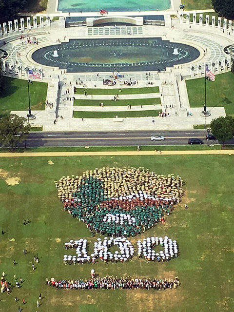 資料圖:8月25日,約千名民眾聚集在華盛頓紀(jì)念碑前的草地上,手舉各色雨傘,組成美國(guó)國(guó)家公園管理局的徽章圖案,慶祝美國(guó)國(guó)家公園管理局成立一百周年。新華社發(fā)