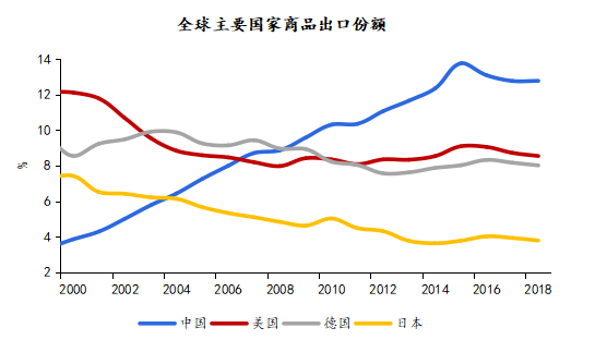 圖表1 中國商品出口占全球份額升至近13%,躍居全球第一