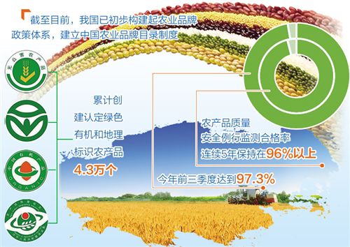 “中國農(nóng)業(yè)品牌正駛?cè)肟焖俳】蛋l(fā)展的快車道,成為現(xiàn)代農(nóng)業(yè)發(fā)展的亮麗風景?!鞭r(nóng)業(yè)農(nóng)村部部長韓長賦表示,近年來我國大力實施品牌強農(nóng)戰(zhàn)略,取得了積極成效。截至目前,已初步構(gòu)建起農(nóng)業(yè)品牌政策體系,建立中國農(nóng)業(yè)品牌目錄制度。累計創(chuàng)建認定綠色有機和地理標識農(nóng)產(chǎn)品4.3萬個,形成了一批特色地域名片。品牌化帶動了農(nóng)業(yè)生產(chǎn)標準化,農(nóng)產(chǎn)品質(zhì)量安全例行監(jiān)測合格率連續(xù)5年保持在96%以上,今年前三季度達到97.3%,更多優(yōu)質(zhì)農(nóng)產(chǎn)品受到消費者青睞。