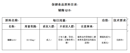 《通知》指出,含輔酶Q10的產(chǎn)品,其輔酶Q10的每日推薦食用量不得超過50mg。我國已批準的輔酶Q10保健食品(增強免疫力、抗氧化保健功能)每日用量范圍是10-50mg。關(guān)于公開征求輔酶Q10等5種保健食品原料目錄意見的公告》明確,輔酶Q10用量范圍為每日30-50mg。