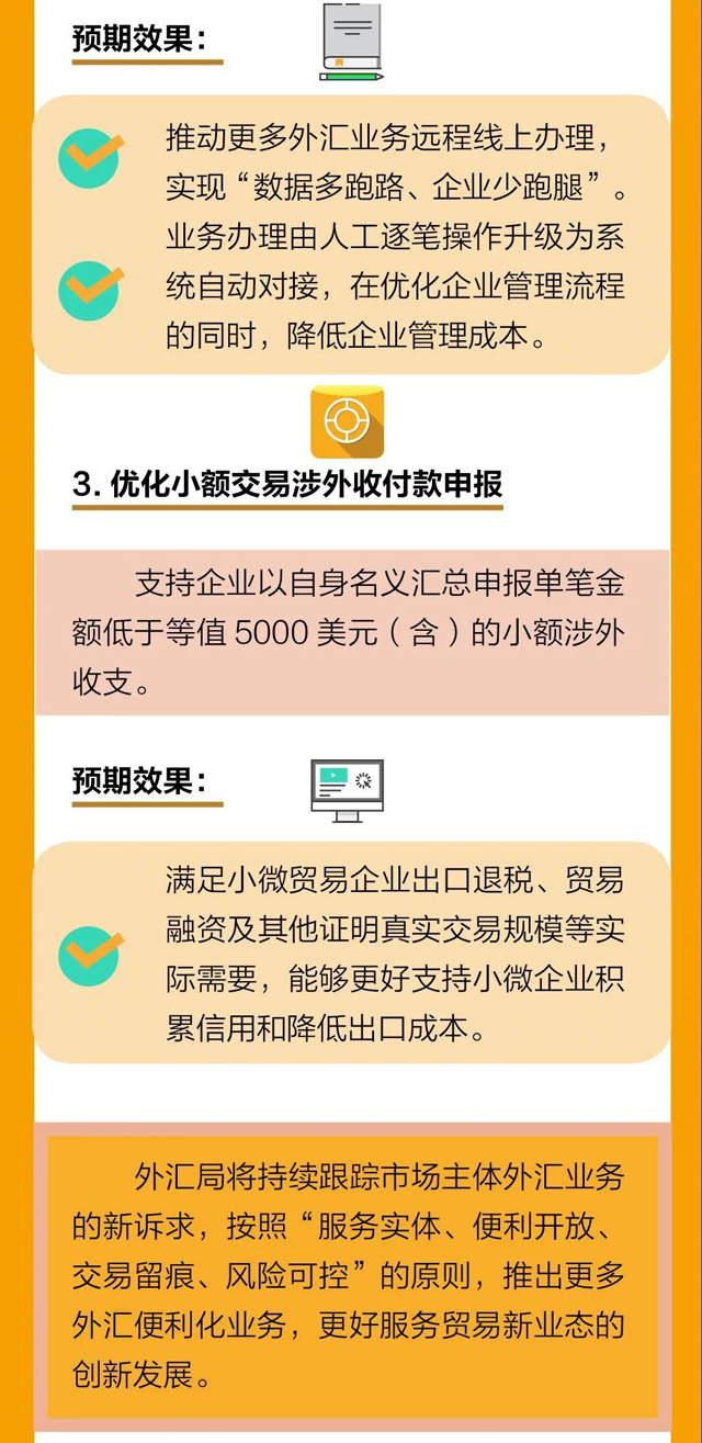 記者梳理發(fā)現(xiàn),《通知》包括9方面內(nèi)容,聚焦解決貿(mào)易新業(yè)態(tài)“小額、高頻、電子化”交易中結(jié)算不便捷問題。政策設(shè)計上,遵循“鼓勵創(chuàng)新、包容審慎”原則,積極適應(yīng)貿(mào)易新業(yè)態(tài)發(fā)展的實際需要。按照“服務(wù)實體、便利開放、交易留痕、風(fēng)險可控”要求,放寬貿(mào)易新業(yè)態(tài)外匯政策,優(yōu)化外匯服務(wù),便利相關(guān)外匯業(yè)務(wù)辦理,實施“交易越合規(guī)、匯兌越便利”的信用約束和分類管理。