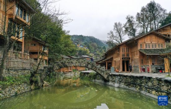 3月18日,在貴州省榕江縣栽麻鎮(zhèn)大利侗寨,村民從月亮山居民宿的小石橋上經(jīng)過(無人機照片)。