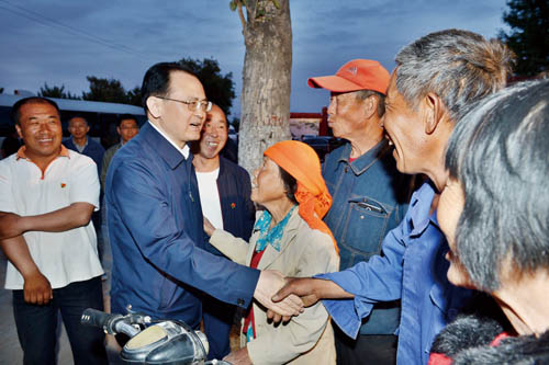 圖為省人大常委會副主任、市委書記李俊明在偏關(guān)縣高家上石會村駐村時和街頭群眾共話脫貧增收大計。(本報記者 宮愛文 攝)