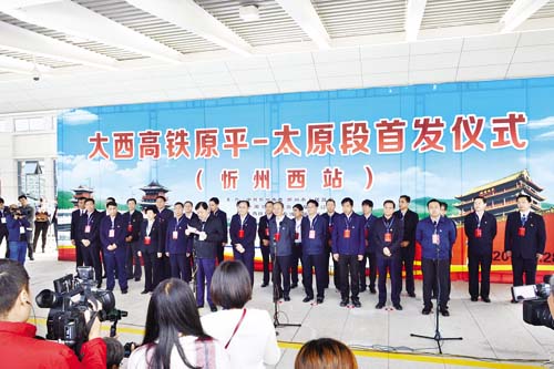 圖為大西高鐵原平至太原段首發(fā)儀式在忻州西站舉行,省人大常委會(huì)副主任、市委書記李俊明宣布高鐵開(kāi)通并發(fā)出發(fā)車指令。本報(bào)記者 宮愛(ài)文 攝