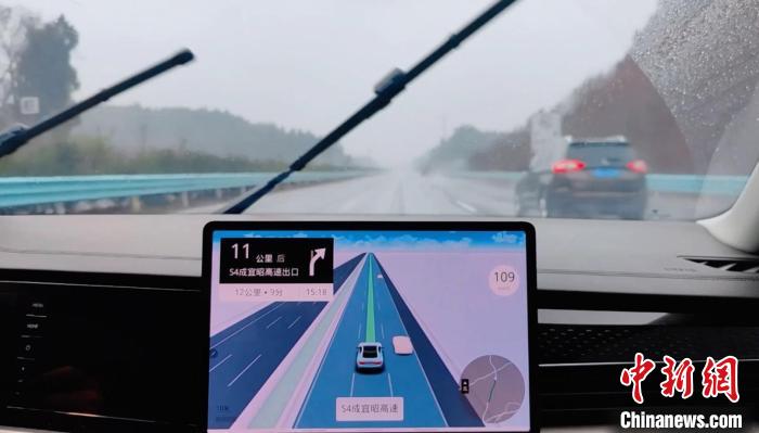 圖為國內(nèi)首個“智慧高速+車機導(dǎo)航”應(yīng)用在下雨的成宜高速上使用。 蜀道集團供圖