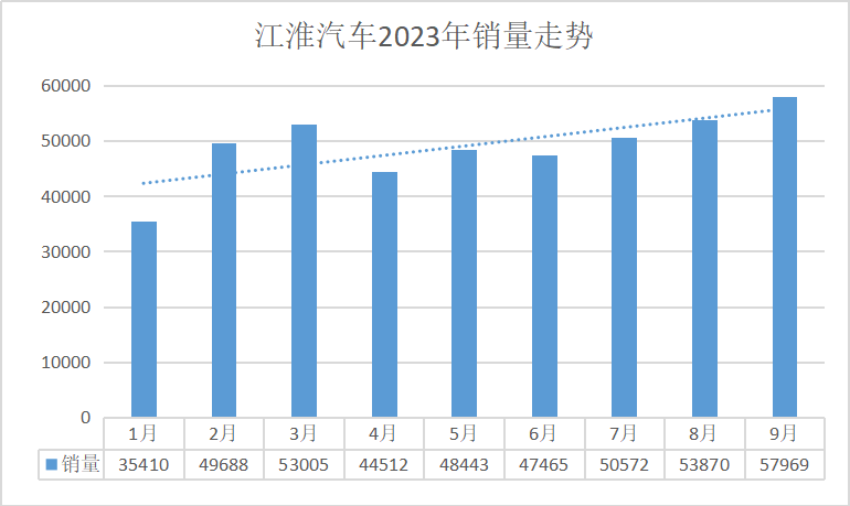 2023年10月10日,安徽江淮汽車集團股份有限公司(以下簡稱“江淮汽車”)發(fā)布《安徽江淮汽車集團股份有限公司2023年9月產(chǎn)、銷快報》??靾箫@示:2023年9月,江淮汽車銷量為5.80萬輛,同比增長21.59%,連續(xù)8個月實現(xiàn)同比正增長;1-9月累計銷售44.12萬輛,同比增長18.70%。