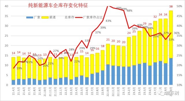 從僅生產(chǎn)新能源車(chē)的企業(yè)的庫(kù)存變化特征分析看,2023年年初庫(kù)存20萬(wàn),年初的庫(kù)存保持較好,總體新能源庫(kù)存在2月后開(kāi)始持續(xù)地上升,目前上升到10月末的38萬(wàn)臺(tái)水平。近期主要增長(zhǎng)的是經(jīng)銷(xiāo)商庫(kù)存,這也是經(jīng)銷(xiāo)模式為主流進(jìn)行新能源銷(xiāo)售的結(jié)果。