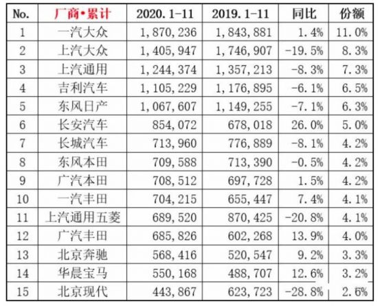 12月10日,乘用車(chē)廠商十五強(qiáng)銷(xiāo)量榜單正式公布,其中漲跌各占半,雖然還剩下最后一個(gè)月銷(xiāo)量未能確定,但目前年度排名已經(jīng)基本成型。