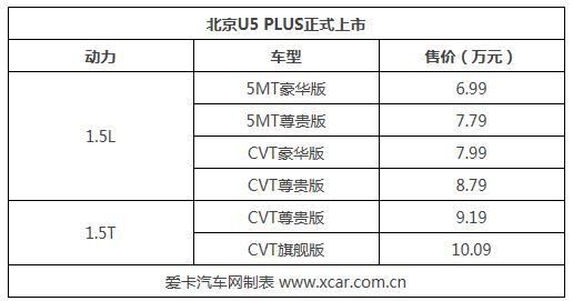 9月23日,北京U5 PLUS正式上市,售價區(qū)間為6.99-10.09萬元。北京U5 PLUS是北京U5的中期改款車型,新車在名字后面加了一個PLUS后綴。北京U5 PLUS配備了最新的北京汽車LOGO,外觀設計更加年輕化、內(nèi)飾科技感更足。詳細售價請見下表:
