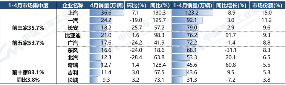 2023年1-4月,國(guó)內(nèi)汽車銷量排名前十位的企業(yè)集團(tuán)銷量合計(jì)為582.2萬輛,同比下降3.6%,較1-3月收窄12.7個(gè)百分點(diǎn),占汽車銷售總量的84.8%,低于上年同期1.8個(gè)百分點(diǎn)。