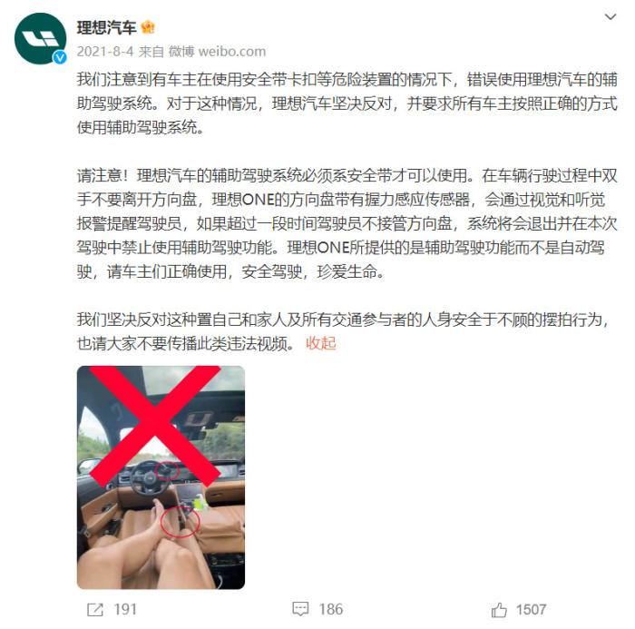 針對上述行為,理想汽車在2021年曾通過微博回應稱,“理想汽車的輔助駕駛系統(tǒng)必須系安全帶才可以使用。在車輛行駛過程中雙手不要離開方向盤,理想ONE的方向盤帶有握力感應傳感器,會通過視覺和聽覺報警提醒駕駛員,如果超過一段時間駕駛員不接管方向盤,系統(tǒng)將會退出并在本次駕駛中禁止使用輔助駕駛功能?!?/p>