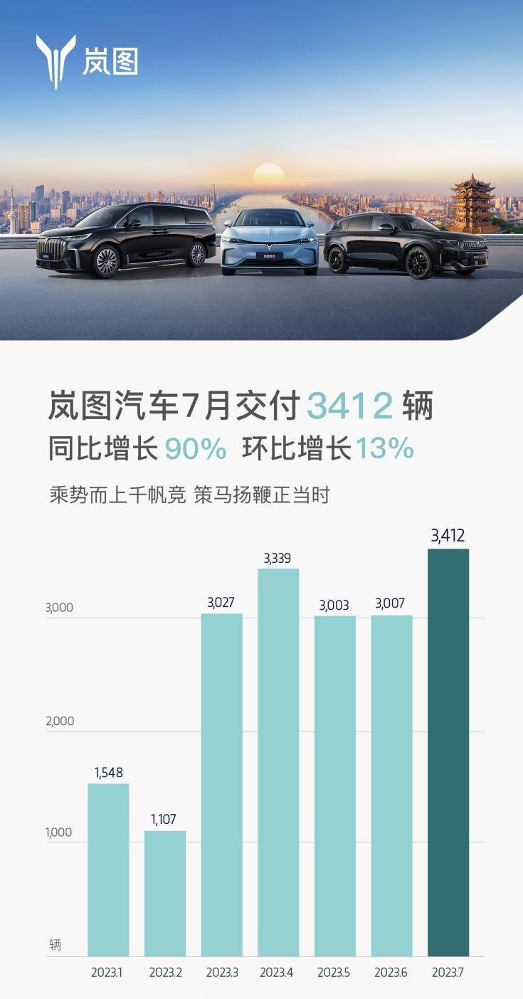 央廣網(wǎng)北京8月1日消息 今日,嵐圖汽車(chē)公布2023年7月交付數(shù)據(jù)。2023年7月,嵐圖交付新車(chē)3412輛,同比上漲90%,環(huán)比上漲13%。在競(jìng)爭(zhēng)愈加激烈的市場(chǎng)競(jìng)爭(zhēng)下,嵐圖汽車(chē)憑借其卓越的產(chǎn)品硬實(shí)力,銷(xiāo)量連續(xù)五個(gè)月超3000輛,潛力持續(xù)釋放。