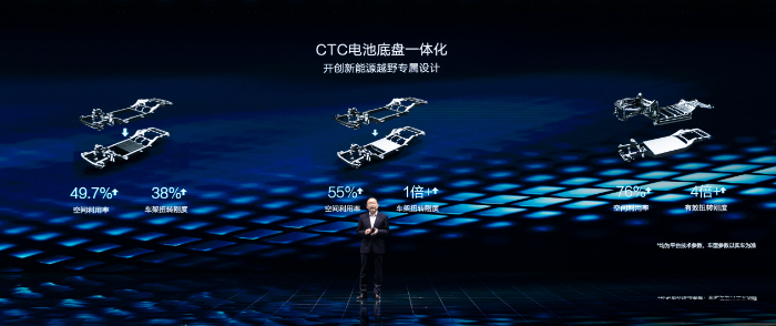 傳統(tǒng)越野車為了提升車身扭轉(zhuǎn)剛度和通過(guò)性,對(duì)大梁進(jìn)行專門強(qiáng)化,這也將進(jìn)一步加大整車重量,并抬升整車重心。DMO以創(chuàng)新性理念,給出“兩全其美”的解決方案:將具備本征安全的刀片電池和高強(qiáng)度鋼大車架強(qiáng)強(qiáng)融合,演化出真正的CTC電池底盤一體化技術(shù)。刀片電池既是能量體、也是結(jié)構(gòu)件,不僅能保證極端越野場(chǎng)景下的電池安全,還能帶來(lái)更多的整車安全提升。