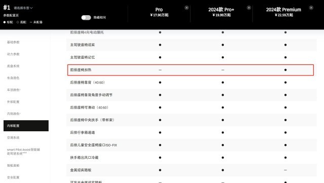 中新經(jīng)緯查詢smart官網(wǎng)發(fā)現(xiàn),前排座椅加熱等功能需要升級車型才能擁有,普通車型并未將其設(shè)為標(biāo)配。以座椅加熱功能為例,官網(wǎng)顯示,有該項配置的smart#1的2024款Premium為22.59萬元起,而未將該功能設(shè)為標(biāo)配的Pro車型,其價格為17.9萬元起。