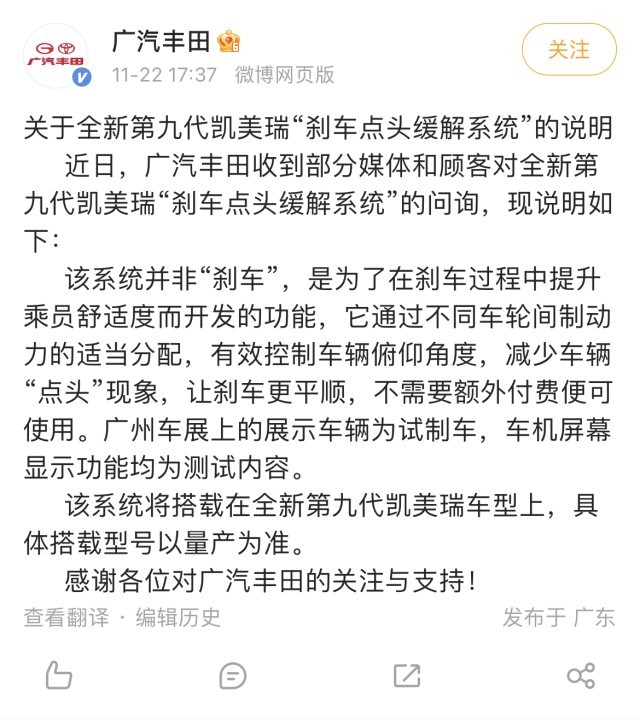 上述功能也曾引發(fā)網(wǎng)友熱議。對此,廣汽豐田公開回應(yīng)稱該系統(tǒng)是為了在剎車過程中提升乘員舒適度而開發(fā)的功能,并非“剎車”,也不需要額外付費。