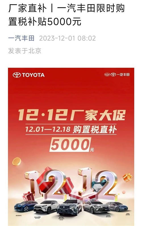 一汽豐田官微公告顯示,一汽豐田宣布開(kāi)啟“雙十二大促”,12月1日至12月18日期間,購(gòu)買(mǎi)格瑞維亞、RAV4榮放、皇冠陸放等部分車(chē)型限時(shí)享受購(gòu)置稅補(bǔ)貼5000元,置換最高可享6000元置換補(bǔ)貼。