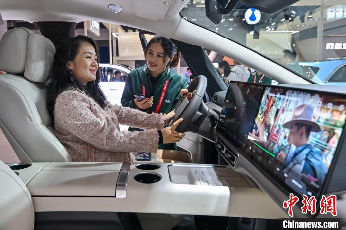 2024海南國際汽車展覽會21日開幕,圖為消費者體驗新款國產(chǎn)純電商務(wù)車。中新網(wǎng)記者 駱云飛 攝