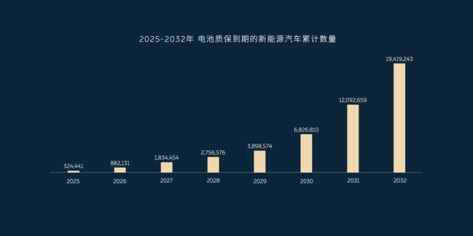 而此時距離2015年恰巧8年時間。蔚來汽車調(diào)查表示,2025到2032年,預(yù)計累計將有近2000萬輛新能源車面臨電池質(zhì)保到期,動力電池將面臨脫保的行業(yè)問題。