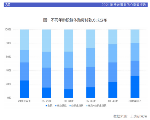 《報(bào)告》還顯示,消費(fèi)客群普遍通過加杠桿方式購房,受調(diào)群體中全款購房比例僅占 18.1%。對(duì)比不同年齡段群體看,25-39歲群體對(duì)杠桿的依賴度較高,貸款購房比例超過8成,其中30-34年齡段群體貸款比例最高,達(dá)87.4%。80前群體資金積累相較充足,對(duì)杠桿的依賴度相對(duì)較低,貸款比例未超過8成。95后父母多為60、70后,而這兩代人已經(jīng)有一定的財(cái)富積累,在購置房產(chǎn)時(shí),有能力對(duì)子女進(jìn)行資助,因此購房群體中全款購房比例相對(duì)較高。從購房群體的需求類型看,首次置業(yè)群體購房杠桿較高,貸款比例達(dá)86.6%。