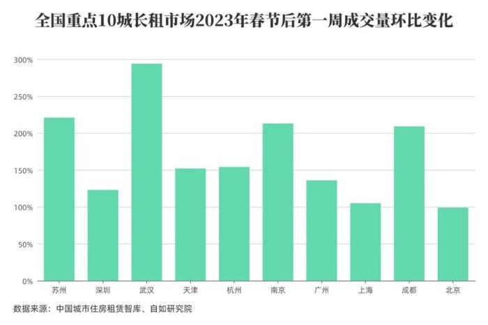 今年春節(jié)期間,中國的旅游、文娛、餐飲等市場明顯升溫,春節(jié)復工后隨著人員流動量增加。智庫和研究院方面認為,住房租賃市場的穩(wěn)步回暖應是趨勢。在長租市場成交量整體呈回升趨勢時,新一線城市的增長幅度明顯高于一線城市。智庫和研究院方面分析,環(huán)比春節(jié)前,北京、上海、深圳三大一線城市春節(jié)后第一周成交量環(huán)比提升近100%;而武漢、南京、成都等新一線城市環(huán)比成交量增長近200%,其中武漢增長約300%。