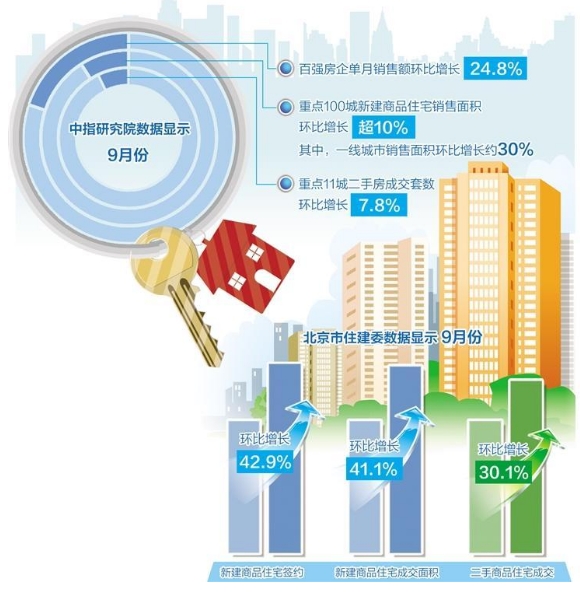隨著需求釋放動能減弱,9月后兩周成交量明顯下降。北京市住建委數(shù)據(jù)顯示,9月份,北京新建商品住宅簽約5891套,成交面積67.96萬平方米,環(huán)比分別增長42.9%和41.1%;二手商品住宅成交14262套,環(huán)比增長30.1%。