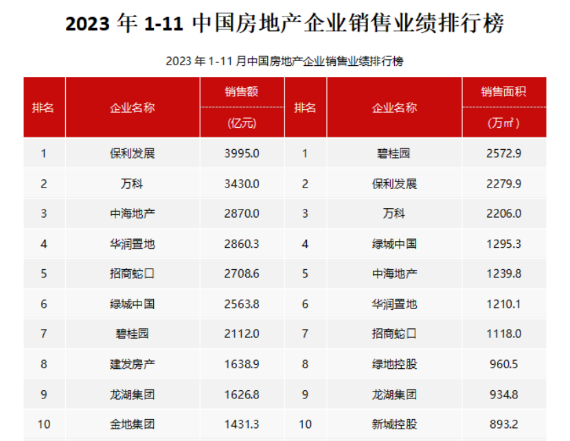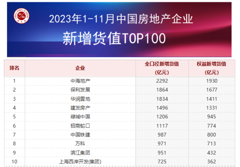 (圖源:中指研究院) 百強(qiáng)房企格局持續(xù)分化,央國企及部分優(yōu)質(zhì)民企韌性較強(qiáng) 克而瑞報告顯示,2023年以來,百強(qiáng)房企格局持續(xù)分化,央國企及部分優(yōu)質(zhì)民企韌性較強(qiáng)、中小房企競爭力不足。從不同梯隊(duì)房企銷售門檻值的變化來看,2023年1-11月TOP10房企的銷售操盤金額門檻同比降低2%至1499.8億元,TOP20門檻降低21.7%至561億元。TOP30和TOP50梯隊(duì)房企格局變動加劇,門檻分別同比降低18.8%和19.7%至352.6億元和217.7億元。TOP100房企的銷售操盤金額門檻則較去年同期降低7.8%至93.4億元。 從企業(yè)表現(xiàn)來看,央國企銷售表現(xiàn)仍較為強(qiáng)勁。2023年1-11月,銷售額同比增長超過10%的大型企業(yè)為,中海、華潤、建發(fā)、越秀、華發(fā)、聯(lián)發(fā)、國貿(mào)地產(chǎn)、中建壹品、中建東孚、象嶼地產(chǎn)等,這些企業(yè)銷售增長較為強(qiáng)勁。 中指研究院企業(yè)研究總監(jiān)劉水分析稱:“這些屬于央國企,融資保持通暢,擁有品牌優(yōu)勢,銷售表現(xiàn)較好?!?/p> “市場趨勢方面,短期來看,二手房掛牌量高企導(dǎo)致二手房價格下跌態(tài)勢延續(xù),部分購房者轉(zhuǎn)向二手房市場,新房市場調(diào)整壓力或仍較大,12月進(jìn)入房企業(yè)績最后沖刺階段,預(yù)計部分城市供給端或有放量,帶動新房成交保持一定規(guī)模,但多數(shù)城市市場活躍度或仍不足?!眲⑺硎尽?/p> 重點(diǎn)房企拿地意愿有所提升,多城市取消土地限價有助于穩(wěn)預(yù)期 根據(jù)中指研究院數(shù)據(jù)顯示,中海地產(chǎn)、保利發(fā)展、華潤置地占據(jù)新增貨值榜單前三位。2023年1-11月,中海地產(chǎn)以累計新增貨值2292億元占據(jù)榜單第一;保利發(fā)展、華潤置地緊隨其后,累計新增貨值規(guī)模分別為1864億元和1834億元。TOP10企業(yè)2023年1-11月新增貨值總額13442億元,占TOP100企業(yè)的41.7%;TOP100企業(yè)新增貨值門檻為121億元。