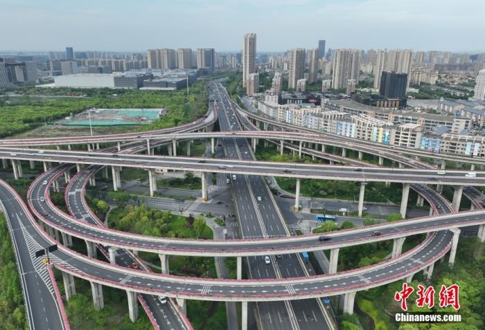 杭州一座高架互通上月季花盛放。(無人機(jī)照片)中新社記者 王剛 攝