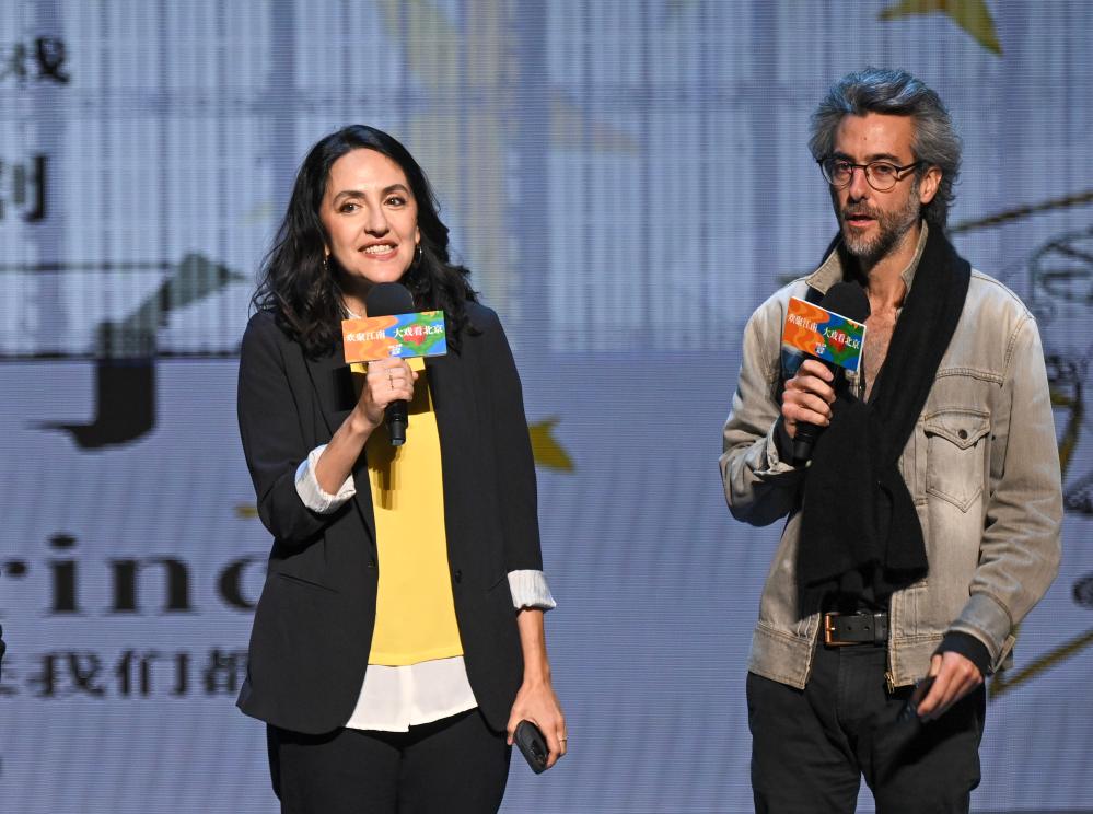 10月12日,在位于北京的中央歌劇院劇場,音樂戲劇《小王子》導演讓·貝洛里尼(右)、總制作人安娜出席發(fā)布會。新華社記者 金良快 攝
