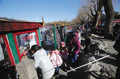 2月1日,北海冰場迎來客流高峰,售票處排起長隊。新京報記者 王飛 攝