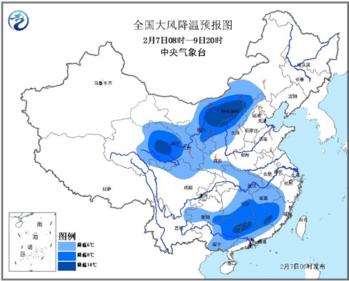 預(yù)計7日08時至9日08時,西北地區(qū)東部、內(nèi)蒙古中西部、山西西部、貴州大部、江南大部和華南中北部等地的部分地區(qū)將出現(xiàn)6℃以上降溫,其中青海東部、陜西北部、內(nèi)蒙古中部、貴州東南部和湖南東南部、江西北部和西部、廣東北部、廣西北部等地的部分地區(qū)降溫幅度可達(dá)8℃以上,局地超過10℃。上述北方地區(qū)并伴有4~6級偏北風(fēng)。