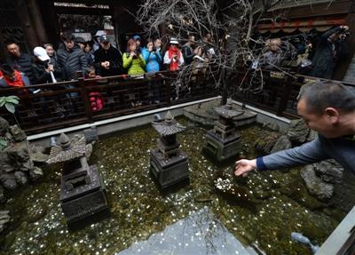中午時(shí)分,記者又一次仔細(xì)觀察了水池,在游人拋投硬幣時(shí),確實(shí)有一兩條金色的觀賞魚(yú)在石縫處游動(dòng)著。在木制欄桿四周,正貼著“禁止倚靠欄桿”、“禁止投幣”等字樣?!按汗?jié)游客爆滿,水池是從寬巷子到窄巷子的必經(jīng)之道,加上很多人在拋硬幣,頓時(shí)人滿為患。我們只好打印了幾張?zhí)嵝褟堎N起來(lái)?!鞭k公室工作人員還表示,“等春節(jié)游客潮稍微退卻,天氣回暖,我們就要派人下水打撈這些硬幣,用于景點(diǎn)建設(shè)?!?/p>