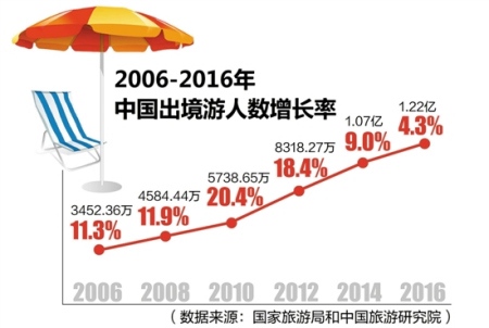 一個典型中國人的出境游 2017年春節(jié)假期,615萬國人到世界各地歡度新春佳節(jié),創(chuàng)出了出境游歷史新高,引來世界矚目。實際上,早在2011年,中國已成為世界第一大客源國,2014年出境游人次首次破億,2016年更是達到了1.22億人次。這一數(shù)字相當(dāng)于我國人口數(shù)量前七位的重慶、上海、北京、成都、天津、廣州、保定的總和,也接近目前日本的總?cè)丝跀?shù)。 數(shù)據(jù)顯示,我國出境游人數(shù)已實現(xiàn)連續(xù)12年刷新歷史紀(jì)錄,中國出境游迎來“井噴”,未來趨勢將會如何?連日來,羊城晚報記者梳理歷年相關(guān)數(shù)據(jù),邀請知名專家解讀,為讀者揭秘出境游那些事兒。 財經(jīng)數(shù)據(jù)眼 數(shù)據(jù)1:勢頭多猛? 出境游頻刷紀(jì)錄 “黃金周”概念風(fēng)靡全球 近年我國出境游增速,可以用“井噴”來形容。根據(jù)國家旅游局公布的2006年至2015年歷年《中國旅游業(yè)統(tǒng)計公報》以及中國旅游研究院和攜程聯(lián)合發(fā)布的《向中國游客致敬——2016年中國出境旅游者大數(shù)據(jù)》顯示,我國出境游人數(shù)已實現(xiàn)連續(xù)12年刷新歷史紀(jì)錄。出境游總?cè)藬?shù)從2006年的3452.36萬人次上升至2016年的1.22億人次,增加了2.5倍。2010年至2013年平均每年增幅接近20%。2014年至2016年增長放緩,分別為7%、7%和4.3%。預(yù)計未來5年,中國出境游客將超過6億人次。