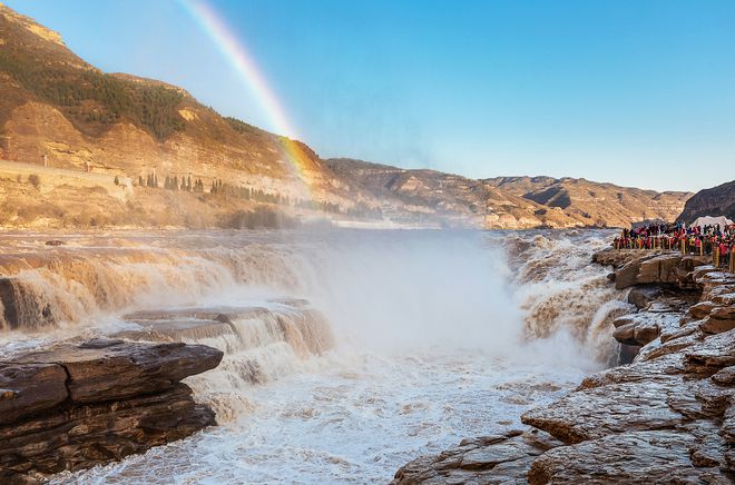 近日,受氣溫回暖影響,位于山西省吉縣和陜西省宜川縣交界處的黃河壺口瀑布冰消河開,再現(xiàn)奔騰咆哮的壯美景觀。受前一段時間凌汛影響,關(guān)閉了半個月的壺口瀑布景區(qū)于2月12日恢復(fù)對外開放。圖為2月12日,游客在山西吉縣黃河壺口瀑布游覽觀瀑(無人機(jī)照片)。