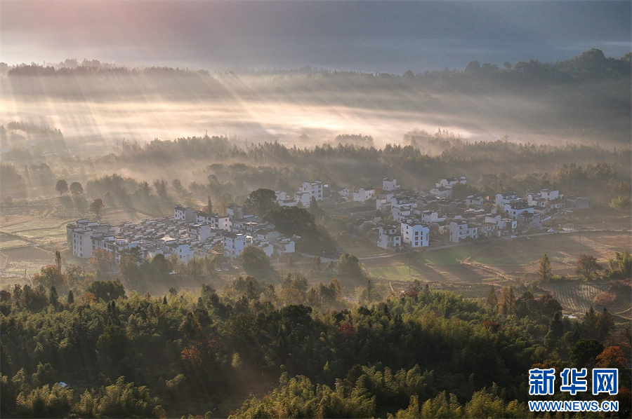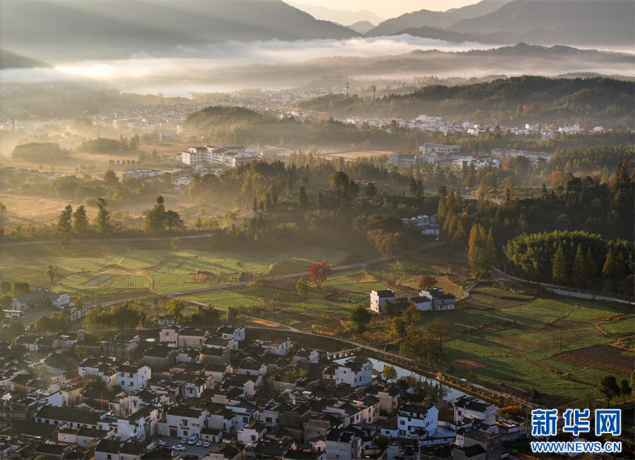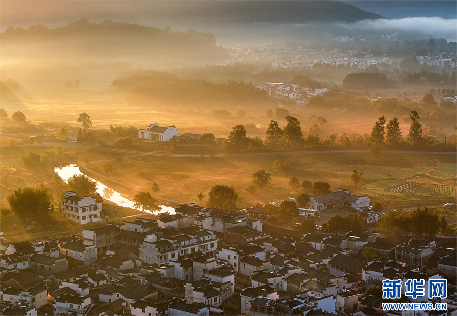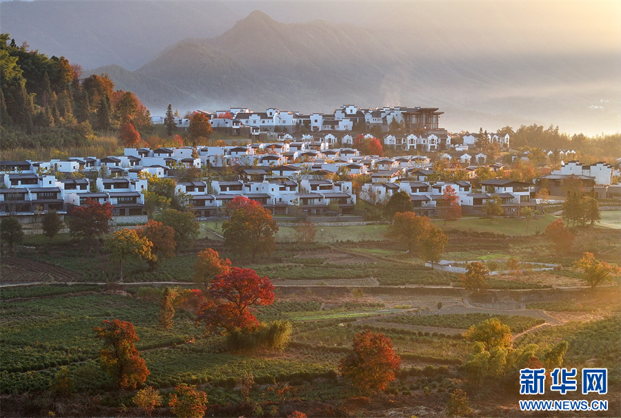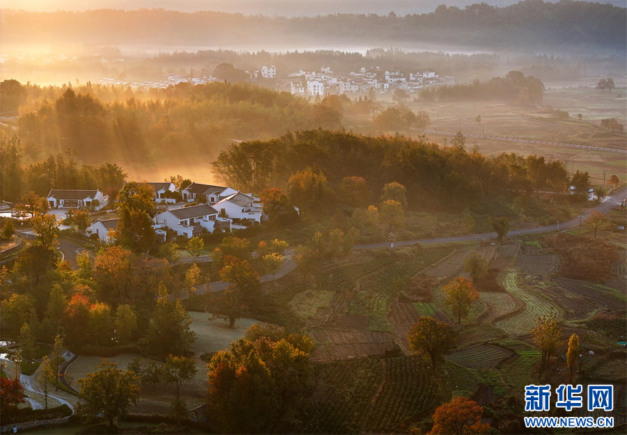 當日,安徽省黃山市黟縣宏村、盧村等地晨霧縹緲,秋色斑斕,粉墻黛瓦掩映其中,宛如一幅幅繽紛多彩的油畫。 新華網(wǎng)發(fā)(施亞磊 攝)