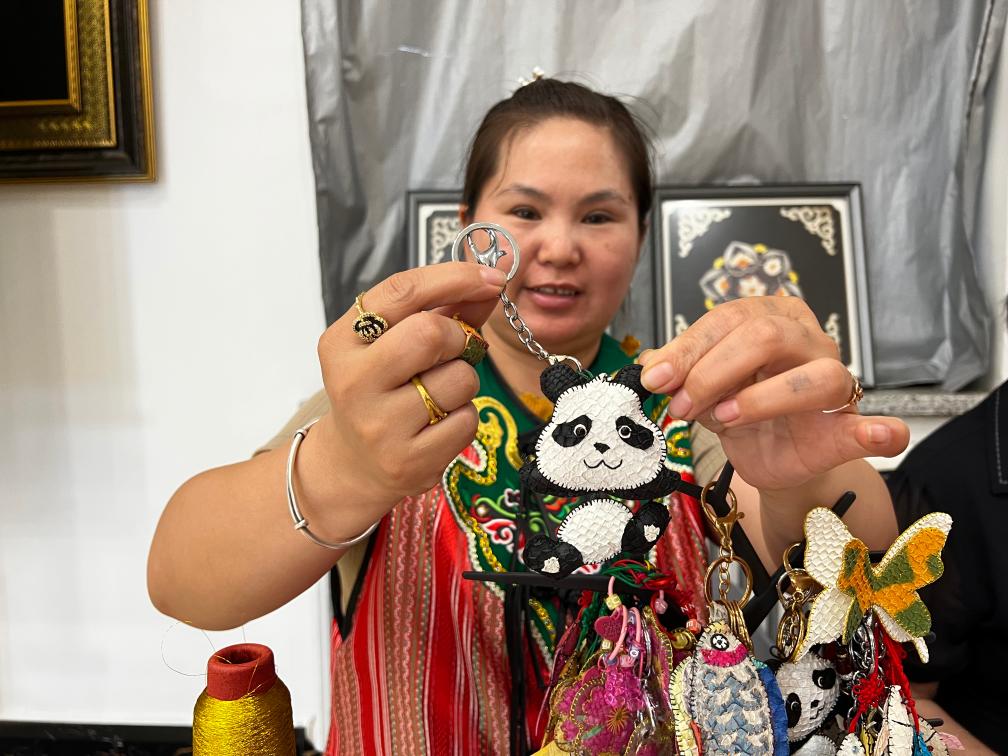 同江市非物質(zhì)文化遺產(chǎn)展示館內(nèi),赫哲魚皮匠人展示由她制作的大熊貓魚皮掛飾。新華社記者 楊軒 攝