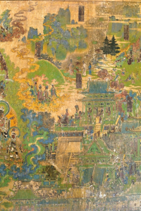 但巖山寺金代壁畫有確切年代,是御前承應(yīng)畫匠王逵用10年時(shí)間才完成這一煌煌巨制。800多年前,王逵面對(duì)四壁,決然舍棄慣常的連環(huán)畫形式,大膽?yīng)殑?chuàng),采用滿幅構(gòu)圖形式,以一組繁雜的宮廷建筑為中心,配以各種故事情節(jié)畫面,然后用山水、樹石、云嵐連結(jié),細(xì)部真實(shí),透視準(zhǔn)確,遠(yuǎn)看儼然一幅氣勢磅礴的大型山水畫,近瞧卻又章回分明。壁畫上就有多處使用瀝粉堆金裝飾,顯現(xiàn)金碧輝煌、富麗非凡的效果。這樣大面積的工筆重彩畫,一絲不茍,找不到起稿與粉本痕跡,而且線條變化多樣,無一廢筆,令人驚嘆。