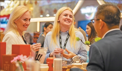 在中國(guó)展區(qū),兩名英國(guó)參展商一邊品茶,一邊與中國(guó)旅游企業(yè)代表交流。本報(bào)記者 許立群攝