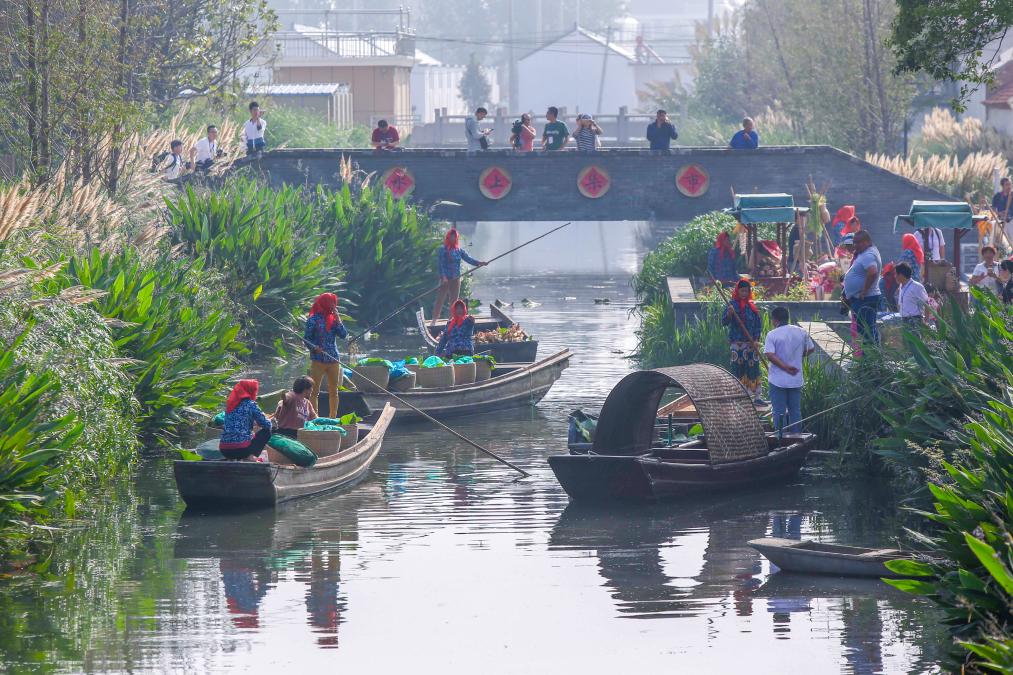 ??2018年9月23日,在江蘇省興化市東羅村舉辦的農(nóng)民豐收節(jié)主題活動(dòng)上,農(nóng)民在“水上市集”展示特色農(nóng)產(chǎn)品。新華社發(fā)(周社根 攝)