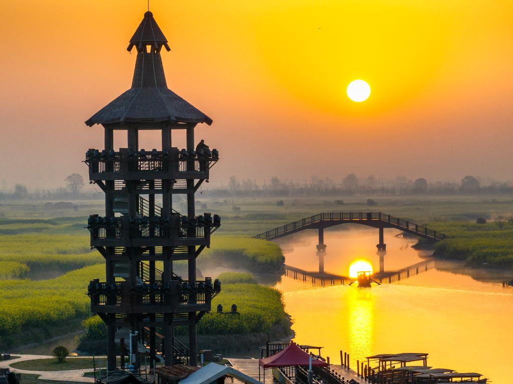 ??2025年4月8日拍攝的江蘇省興化市千垛景區(qū)日出晨景(無(wú)人機(jī)照片)。新華社發(fā)(周社根 攝)