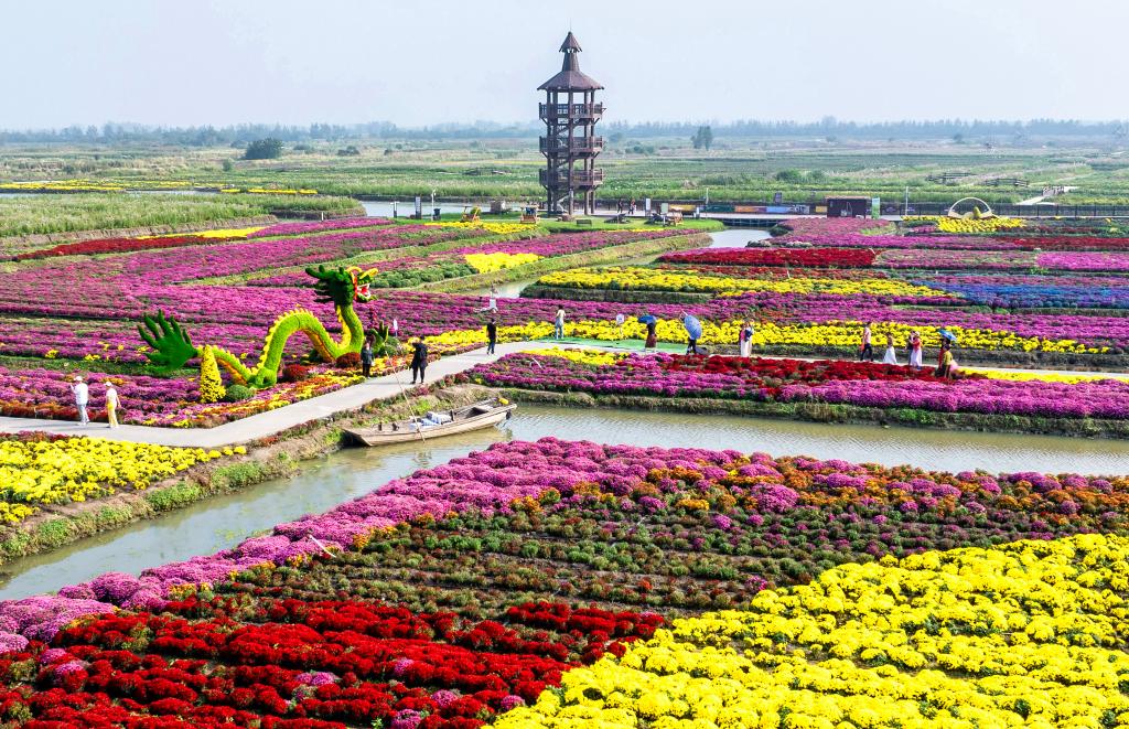??2025年10月13日,游客在江蘇省興化市千垛景區(qū)賞菊游玩(無(wú)人機(jī)照片)。新華社發(fā)(周社根 攝)