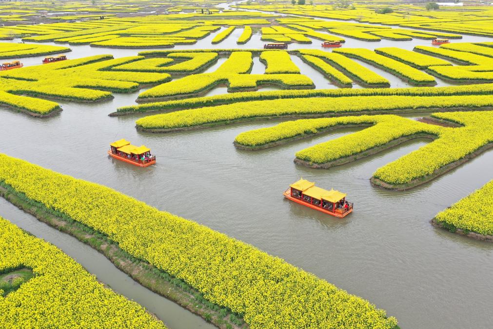 ??2023年3月29日,游客乘坐畫(huà)舫欣賞千垛菜花風(fēng)景區(qū)兩岸油菜花(無(wú)人機(jī)照片)。新華社記者 毛俊 攝