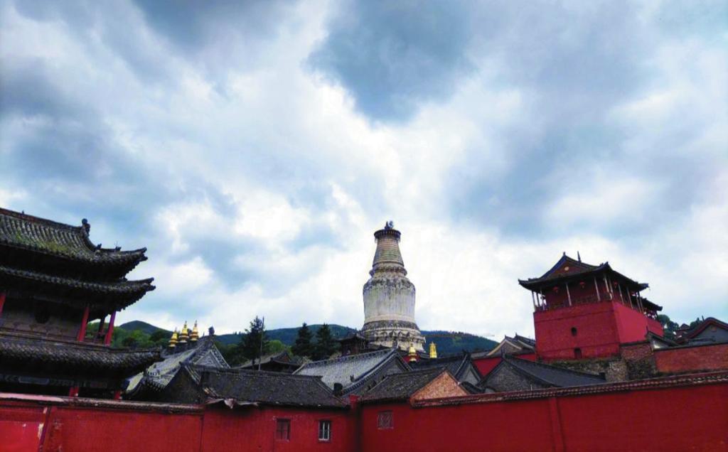 五臺(tái)山最具代表性的鈴聲就是從塔院寺高聳入云的大白塔上傳出的風(fēng)鈴聲。大白塔環(huán)周83.8米,通高75.3米,塔高56.4米,比北京北海白塔還高20.5米,比代縣阿育王塔高16.5米,是元大德五年(1301年)由尼泊爾匠師阿尼哥設(shè)計(jì)建造的尼泊爾式大塔,也是我國現(xiàn)存元代最高的覆缽式塔建筑。大白塔基座呈東、西、南、北、東南、東北、西南、西北八角形,塔身上面13層,呈由粗及細(xì)的輪狀造型,稱“十三天”,又名“十三相輪”。“十三天”上面蓋著8塊銅板,按乾、坎、艮、震、巽、離、坤、兌八卦位置安裝,周長23.1米,檐邊吊裝銅質(zhì)垂檐36塊,共安裝風(fēng)鈴108個(gè),連同束腰風(fēng)鈴共252個(gè)。塔頂裝有高5.4米的鍍金寶瓶。整座白塔形如藻瓶,上下比例協(xié)調(diào),造型別致典雅。每當(dāng)風(fēng)吹鈴響,風(fēng)鐸鳴四端,悠然成風(fēng)韻,讓人油然而生崇敬之感。