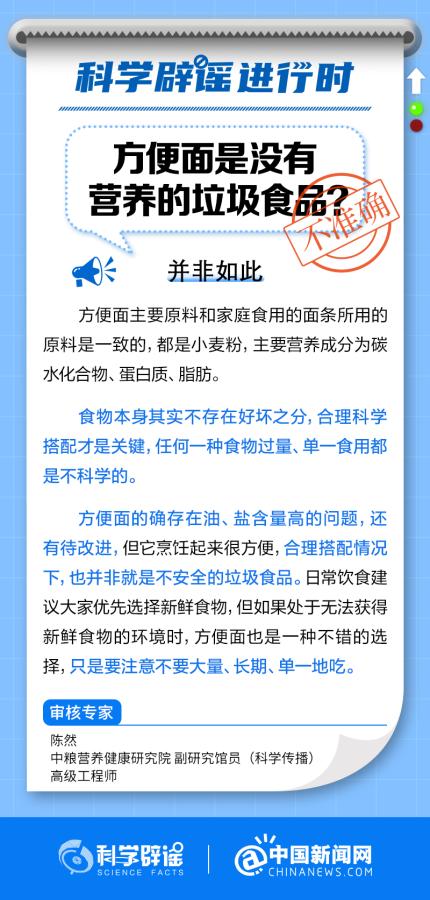 方便面的確存在油、鹽含量高的問題,但它烹飪起來很方便,合理搭配情況下,也并非就是不安全的垃圾食品。日常飲食建議大家優(yōu)先選擇新鮮食物,但如果處于無法獲得新鮮食物的環(huán)境時(shí),方便面也是一種不錯(cuò)的選擇,只是要注意不要大量、長期、單一地吃。(來源:@科學(xué)辟謠 @中國新聞網(wǎng) )